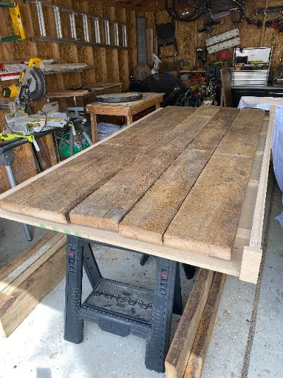I recently discovered a reclaimed barn wood supplier in the southeast Michigan area. I paid a visit and was impressed by their large wood selection. When I returned home from the visit, I decided to try my hand in building barn wood furniture. A few weeks later, I returned and purchased some wood. I got pine boards for the top and apron and old hand hewn beams for the legs. In case you are wondering, hewn is another word for chopping or cutting. It is used to describe old wood that was been processed by hand will tools of the day. When I returned home will the wood, I quickly realized nothing is straight. The wood is twisted, cupped, bowed, and curved. See picture below. This was taken when I first got back to my shop and laid out the wood.