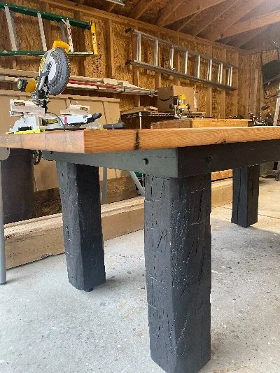 Milling the wood flat and straight for the top glue up was a challenge. I used a router sled to help flatten the top. Also, there were a lot of knots, cracks, and voids. This is a typical characteristic that gives this wood it’s style. I decided to use black tinted epoxy to fill these. I then coated the entire top with multiple coats of epoxy. This helps to seal and gives it more durability. The under side of the top is reinforced with steel tube that is infused into the wood with more epoxy. This will prevent warping and bowing down the road. Finally, I coating the top with a thin layer of a different type of epoxy. This gives the top a matte and highly scratch resistant finish.